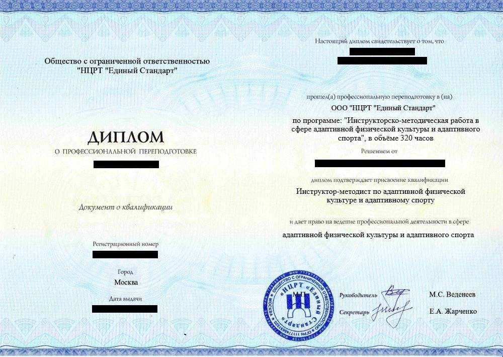 • «Инструктор-методист по адаптивной физической культуре и адаптивному спорту» с правом ведения профессиональной деятельности в сфере адаптивной физической культуры и адаптивного спорта