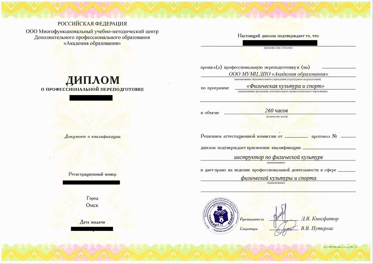 • «Инструктор по спорту», «Инструктор по физической культуре» с правом работы в сфере физической культуры и спорта;