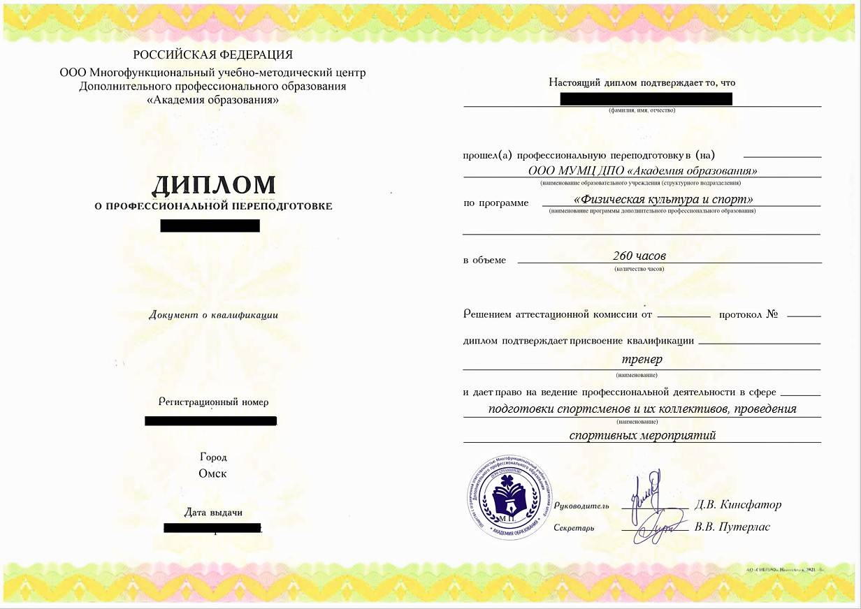 • «Тренер» с правом работы в сфере подготовки спортсменов и их коллективов, проведения спортивных мероприятий;